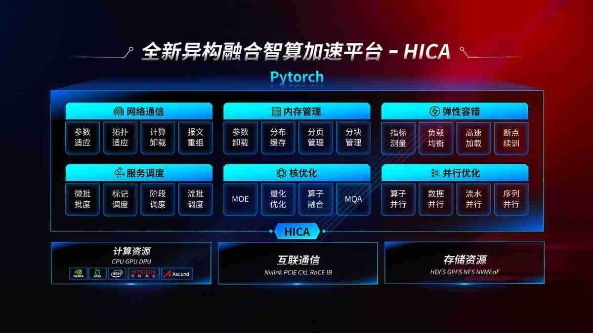 通过自研的服务层、、、、中间适配层、、以及调度编排算法,,,采用数据并行、、模型并行等多种并行方式,,,把并行计算任务进行有效的分解,,使其分别由相应的软件栈和算力资源来承接。。当GPU资源变化,,HICA可以实时动态调度计算子任务并调整模型拓扑和架构,,,,以充分聚合各种算力资源。。。。