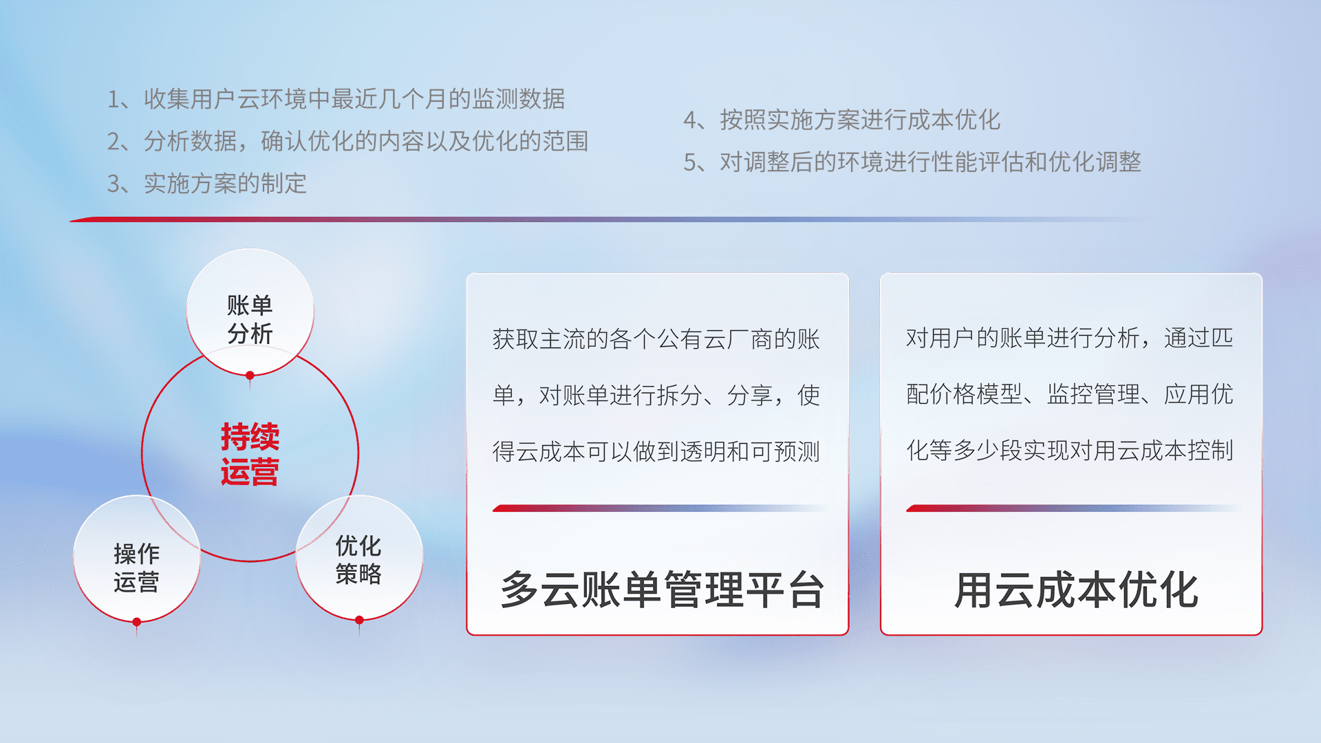 通过多云纳管,,,以统一的资源数据模型把客户的云资源进行抽象和封装,,,,进而实现对多云资源的统一操作,,,,保障云资源管理的可靠性、、稳定性与可用性。。。。量身定制化运维内容,,配置、、、、开发运维、、、补丁管理、、、、备份、、、监控、、、、认证和访问管理、、、、审计和日常巡检等,,保障在用云过程中的可靠度,,,,稳定度以及高可用率。。。。