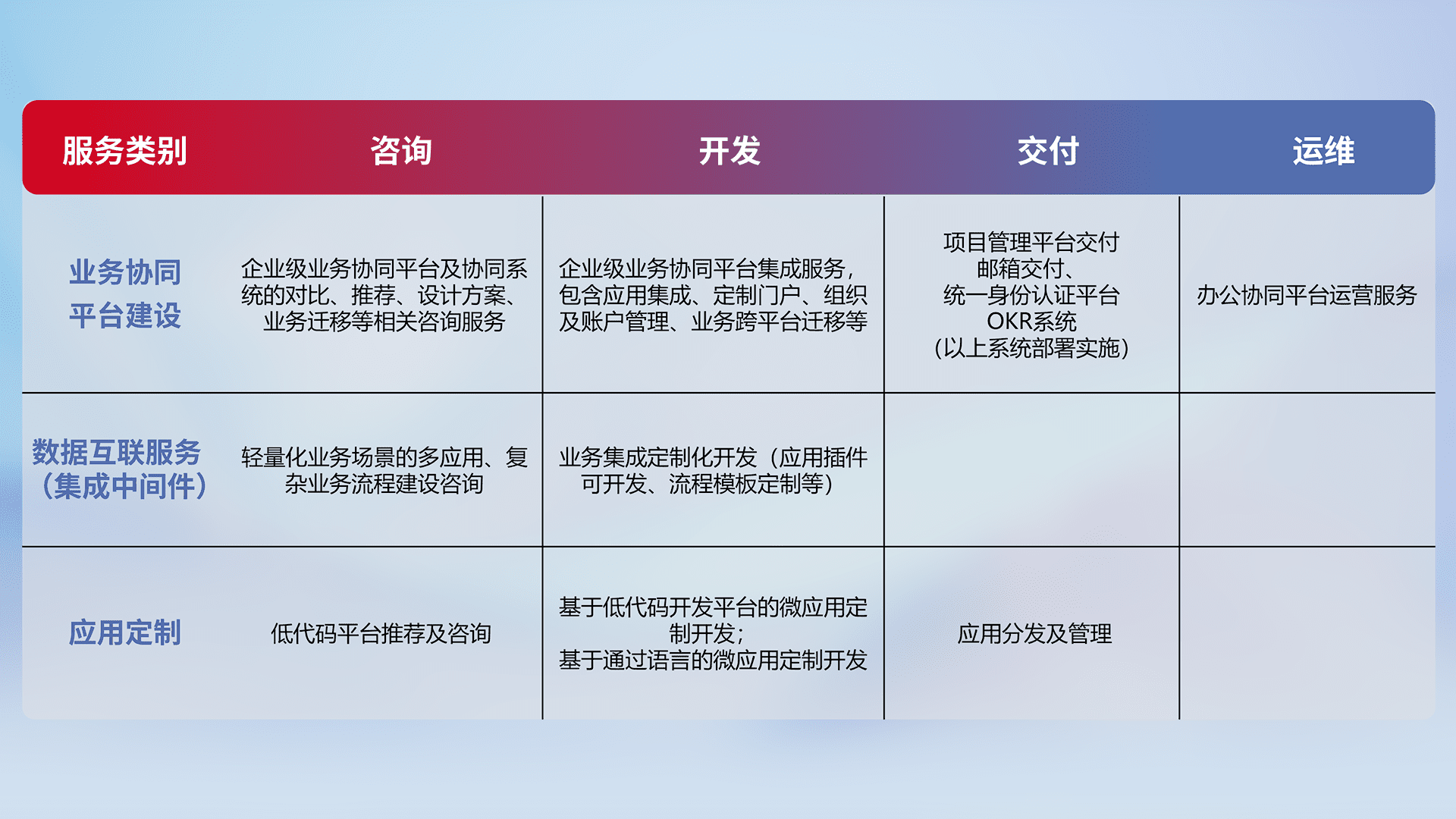 针对钉钉、、、企微、、IDaas等平台级产品提供产品的规划、、、方案、、交付、、定制化开发等服务,,,,实现如统一协同办公、、、智能客户服务、、混合会议管理、、、智能数据查询、、、等业务场景,,,,实现数字化转型。。